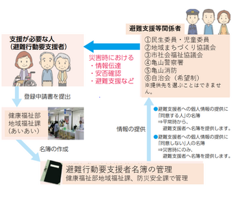「避難行動要支援者名簿」に登録した人のうち、避難支援等関係者(警察、消防、自治会など)に情報提供することを同意した人のみ、平常時から避難支援等関係者に情報提供を行い、日頃の見守りや災害発生時の支援につながる体制づくりを進めています。
