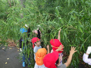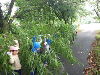 もうすぐ7月7日七夕の日。各クラス、年齢に合わせて七夕飾りをつくりました。いよいよ、七夕飾りをつくる笹をとりに行くことに。