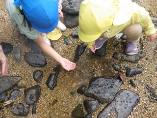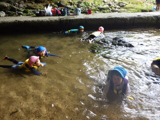 加太ならではのきれいな川での川遊び。前日に仕掛けた魚のしかけがどうなっているかを見たり、少し川の流れを感じるところで流れに身を任せて流れてみたり、保護者の人のトンネルをくぐってみたり、川上に探検に出掛けたりしました。