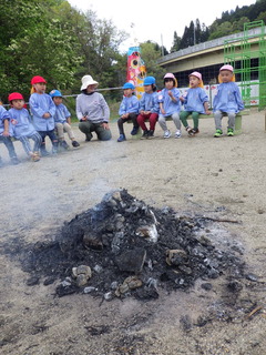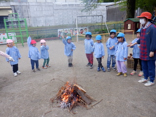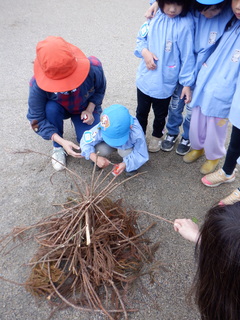 たけのこ掘りの後は急いで園に帰って火おこしの準備です。集めた木々を組んでいき、火を付けました。風があったため、みんなで囲って風よけを作ったおかげで火おこし大成功!