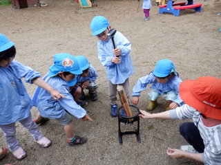 せっかくなので、みんなでたけのこパーティーをすることにしました。前もって、5歳児は「薪割り」に挑戦!