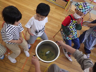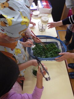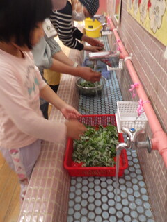 野外に出掛けると、よく見かけるよもぎ。昨年、よもぎなどを使って「ポプリ」を作った経験から、子どもたちの身近な植物でもあります。子どもたちから「『よもぎのホットケーキ』を作りたい!」との声があり、「かぶすけさん」に相談して、よもぎホットケーキを作ることになりました。
