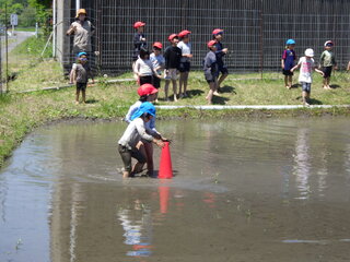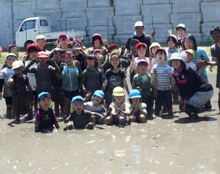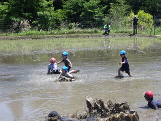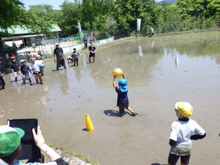 田植えの後は、リレーやドッジボール、ダイビングをしてどろんこになって遊びました。