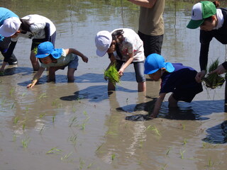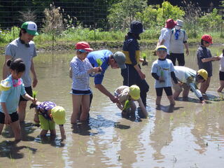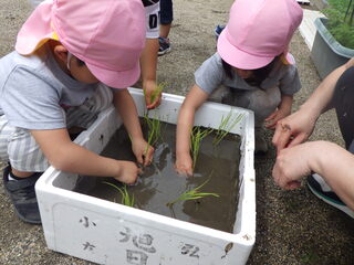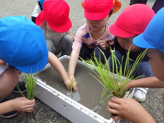 苗をいただいたので、保育園でも稲を植えました。年中・年少児にとって、苗を植えることは難しかったようですが、先に田植えを経験した年長児が手伝ってくれて植えることができ、大満足でした。苗がどうなっていくのか、楽しみだね。