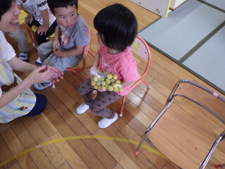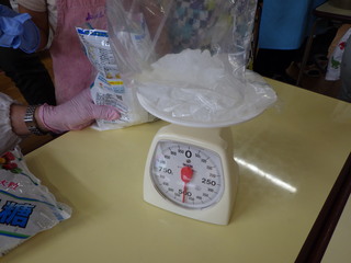重さ比べ・・・氷砂糖と梅。どんな感じかな?どっちが重いかな? 「甘いにおいがする」