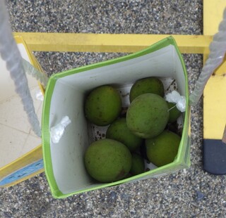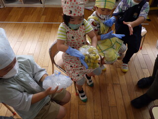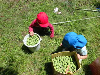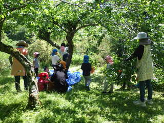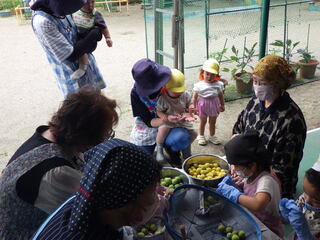 地域の方にいつも声を掛けていただき、梅収穫をさせていただいています。今年も近くを散策している時に「今から行こうか」と言っていただき、うれしさ100倍。木に登って採ったり、枝を引っ張ってもらって採ったり、抱っこしてもらって手を伸ばしたり、たくさん採れました。