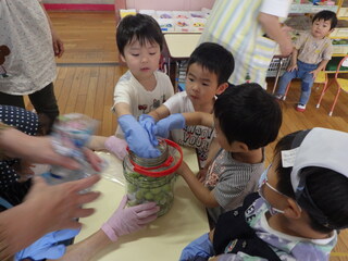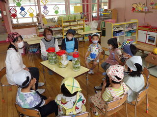 大きいビンに「青梅」と「黄梅」、小さいビンに「青梅」。梅シロップづくり終了後、かぶすけさんと活動の振り返りタイム。「梅ジュース」、「梅ゼリー」つくりたいものがどんどんでてきたよ。かぶすけさん、いつもありがとうございます。