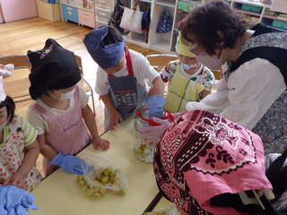 梅がたくさん採れたので、梅シロップをつくることにしました。かぶすけさん(加太保育園自然保育助っ人隊)に来ていただきました。