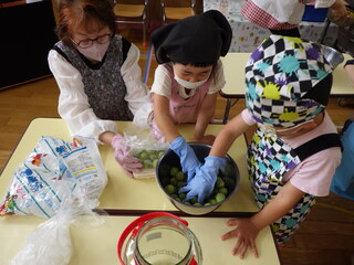 あお組は、かぶすけさんと一緒に梅のなり口についているヘタをつまようじで取りました。洗って拭いて、梅を分けたよ。