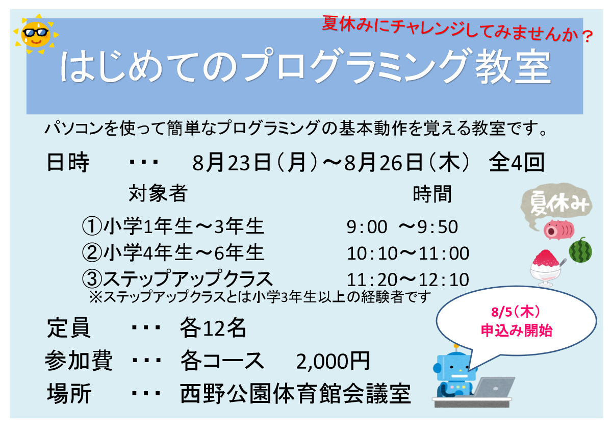 - パソコンを使って簡単なプログラミングの基本動作を覚える教室です。