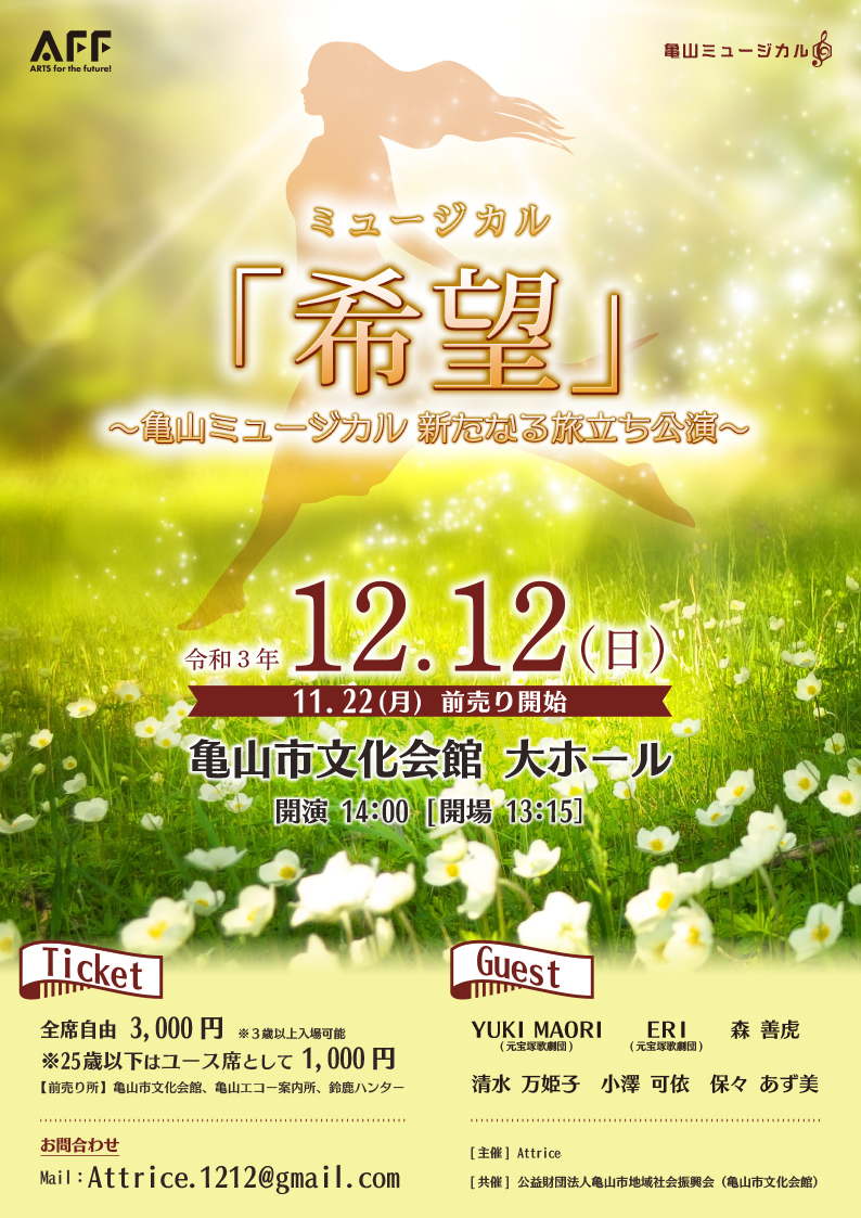 - ミュージカル「希望」~亀山ミュージカル新たなる旅立ち公演~と題して、これまで亀山ミュージカルで上演した、「ソラリス」「遙かなる時を越えて」「TAKERU」「鈴鹿御前」などの中から、歌やダンス、芝居を盛り込んだダイジェスト版を上演します。