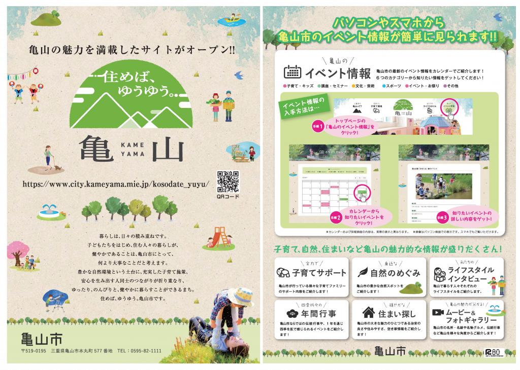 公開日 2017年03月21日 2017-03-21 15:53 ■ 内容 子育て、自然、住まいなど亀山の魅力的な情報が盛りだくさん。 『イベントカレンダー』では、子育て世代にうれしいイベント情報を発信していきます。 ぜひチェックしてくださいね! ■ お問い合わせ 広報秘書室 TEL:0595-84-5021